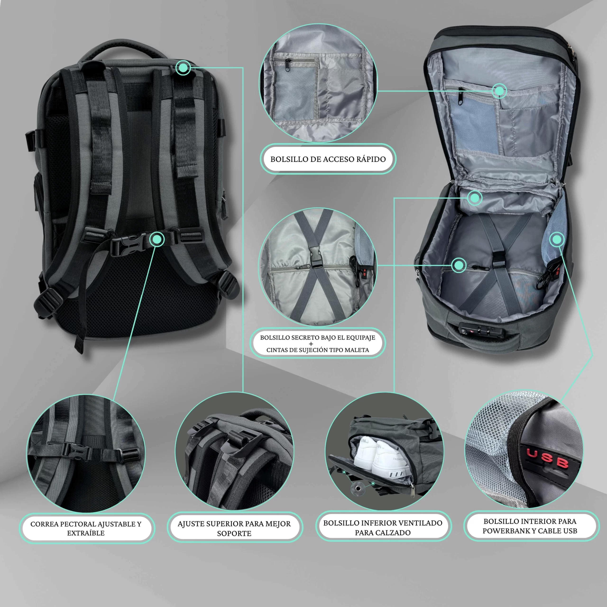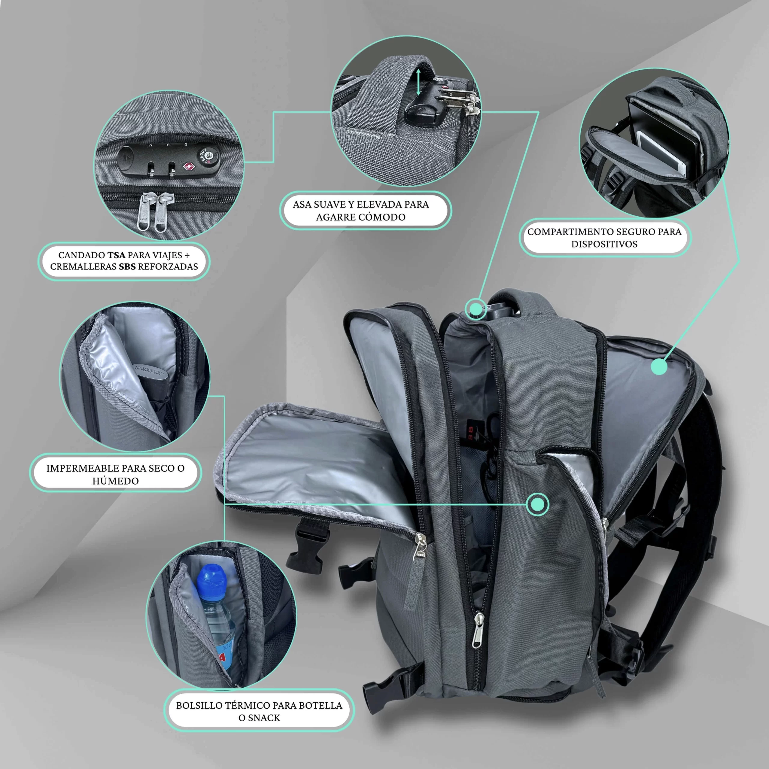 Naujos kartos rankinis bagažas kuprinė, atitinkanti griežčiausius oro linijų reikalavimus. Pagaminta iš vandeniui atsparaus Oxford 900D audinio, su TSA spynelė ir patvariais SBS užtrauktukais. Patogi ortopedinė nugarėlė ir modernus dizainas užtikrina komfortą tiek kelionėse, tiek kasdien naudojant.
